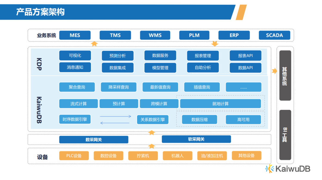 数据存到 KaiwuDB 中,我们也会基于就地计算技术向上层的 KDP(数据服务平台)提供计算和查询服务:流式计算、预计算、聚合查询、降采样查询等。