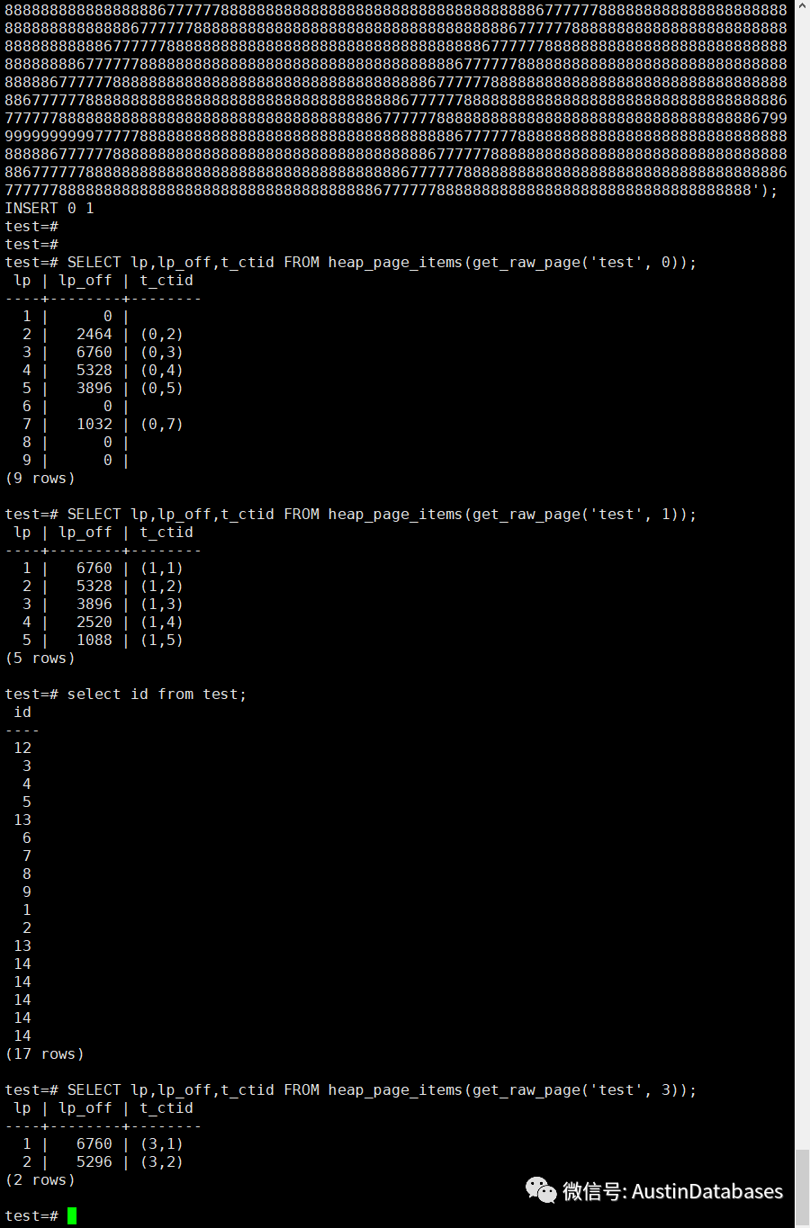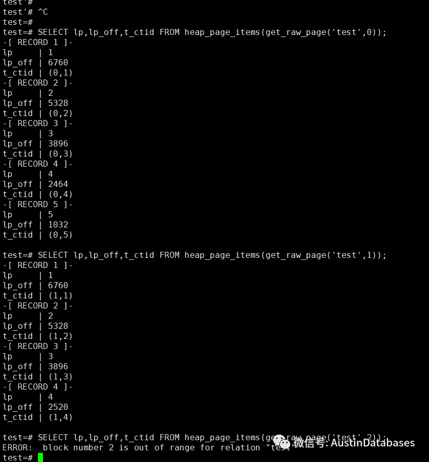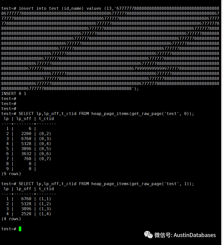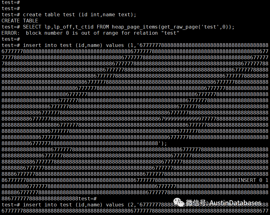 然后我们,添加索引,删除数据99%,剩下1000行,然后在进行vacuum 的操作,最后看这表,还是 1710MB .提问同学的“ 1 个亿的小目标”达到了,也就是说我们还原的,那位客官所提到的部分问题。然后我们继续往里面灌入数据,只是插入,不进行任何的UPDATE 操作,然后我们不断查看表空间的扩展情况, 并未如我们所愿插入的数据使用了原有我们认为可以利用的数据清理后的空间。那么提出的问题是,在什么状态下,PG 在数据的操作中,会出现无法利用原有空间的情况。1 原始插入的数据小,UPDATE 后的数据大,并且填充因子设置上并未考虑此问题的情况下,会产生此问题。但基于PG 支持TOAST 功能,所以在处理这个问题方面上,超大的字段,并不会引起页面无法重复利用的问题。test=# create table test (id int,name text);test=# SELECT lp,lp_off,t_ctid FROM heap_page_items(get_raw_page('test',0));ERROR: block number 0 is out of range for relation "test"test=# insert into test (id,name) values (1,'677777788888888888888888888888888888888888677777788888888888888888888888888888888888677777788888888888888888888888888888888888677777788888888888888888888888888888888888677777788888888888888888888888888888888888677777788888888888888888888888888888888888677777788888888888888888888888888888888888677777788888888888888888888888888888888888677777788888888888888888888888888888888888677777788888888888888888888888888888888888677777788888888888888888888888888888888888677777788888888888888888888888888888888888677777788888888888888888888888888888888888677777788888888888888888888888888888888888677777788888888888888888888888888888888888677777788888888888888888888888888888888888677777788888888888888888888888888888888888677777788888888888888888888888888888888888677777788888888888888888888888888888888888677777788888888888888888888888888888888888677777788888888888888888888888888888888888677777788888888888888888888888888888888888677777788888888888888888888888888888888888677777788888888888888888888888888888888888677777788888888888888888888888888888888888679999999999997777788888888888888888888888888888888888677777788888888888888888888888888888888888677777788888888888888888888888888888888888677777788888888888888888888888888888888888677777788888888888888888888888888888888888677777788888888888888888888888888888888888677777788888888888888888888888888888888888677777788888888888888888888888888888888888');