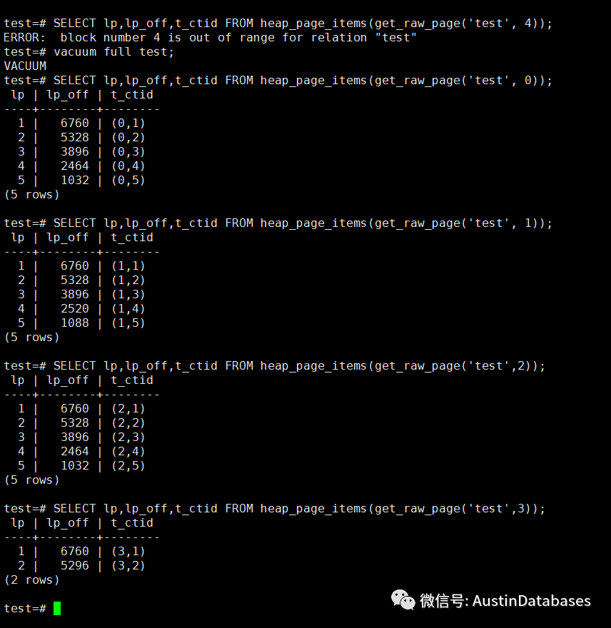 数据分别在第一页和第二页插入,说明删除的数据空间并不能马上被重复利用。而我们继续插入数据,则此时,发现空出的空间不能被使用,即使你做了vacuum 的工作,新的数据已经创建了新的页面。
