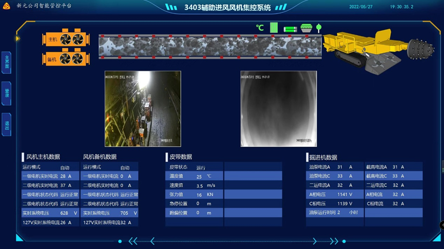 新元公司综合智能管控平台采用力控组态软件,以数据采集与历史存储双冗余架构,确保远程监控可靠稳定运行,实现了主运输皮带、局部通风机远程、综采工作面、主通风机集中监控,配电室、井下水仓、瓦斯泵站、压风机等系统无人值守。