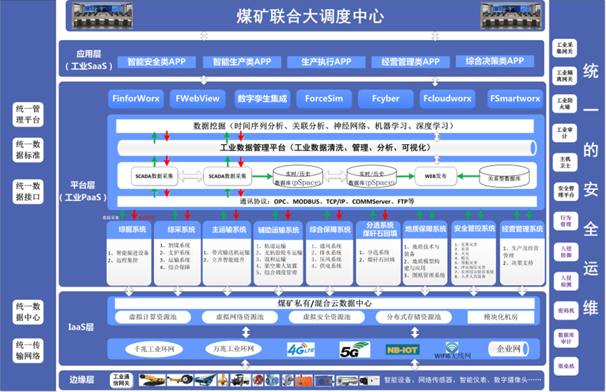 管理平台主要采用力控家族产品,工业SCADA平台组态软件eForceCon负责采集现场数据,企业级实时历史数据库pSpace负责保存历史数据,综合可视化平台FWebView负责搭建web和手机APP平台,通过组态接入各子系统,包括综采工作面监控系统、皮带监控系统、压风机监控系统、水仓监控系统、局部通风机监控系统等。
