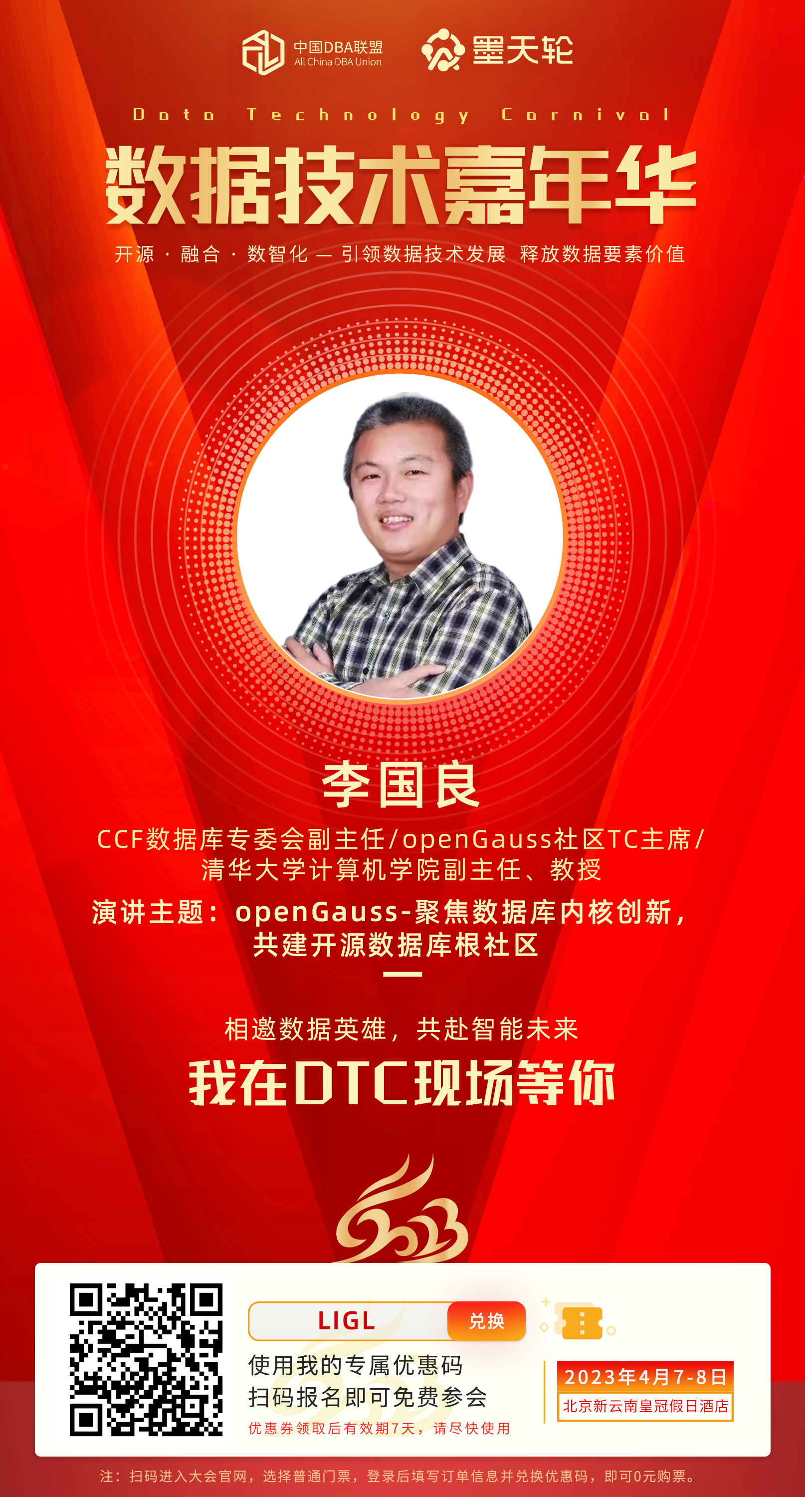 2023年4月7日,由中国 DBA 联盟(ACDU)和墨天轮社区联合主办的第十二届 『数据技术嘉年华』 将在北京新云南皇冠假日酒店盛大开启。本届大会邀请到CCF数据库专委会副主任,openGauss社区TC主席,清华大学计算机学院副主任、教授李国良先生,他将围绕 《openGauss:聚焦数据库内核创新,共建开源数据库根社区》 主题进行分享。现在通过下方海报上的专属优惠码即可在嘉年华官网购票时,0元购取普通门票一张,数量有限,先到先得!