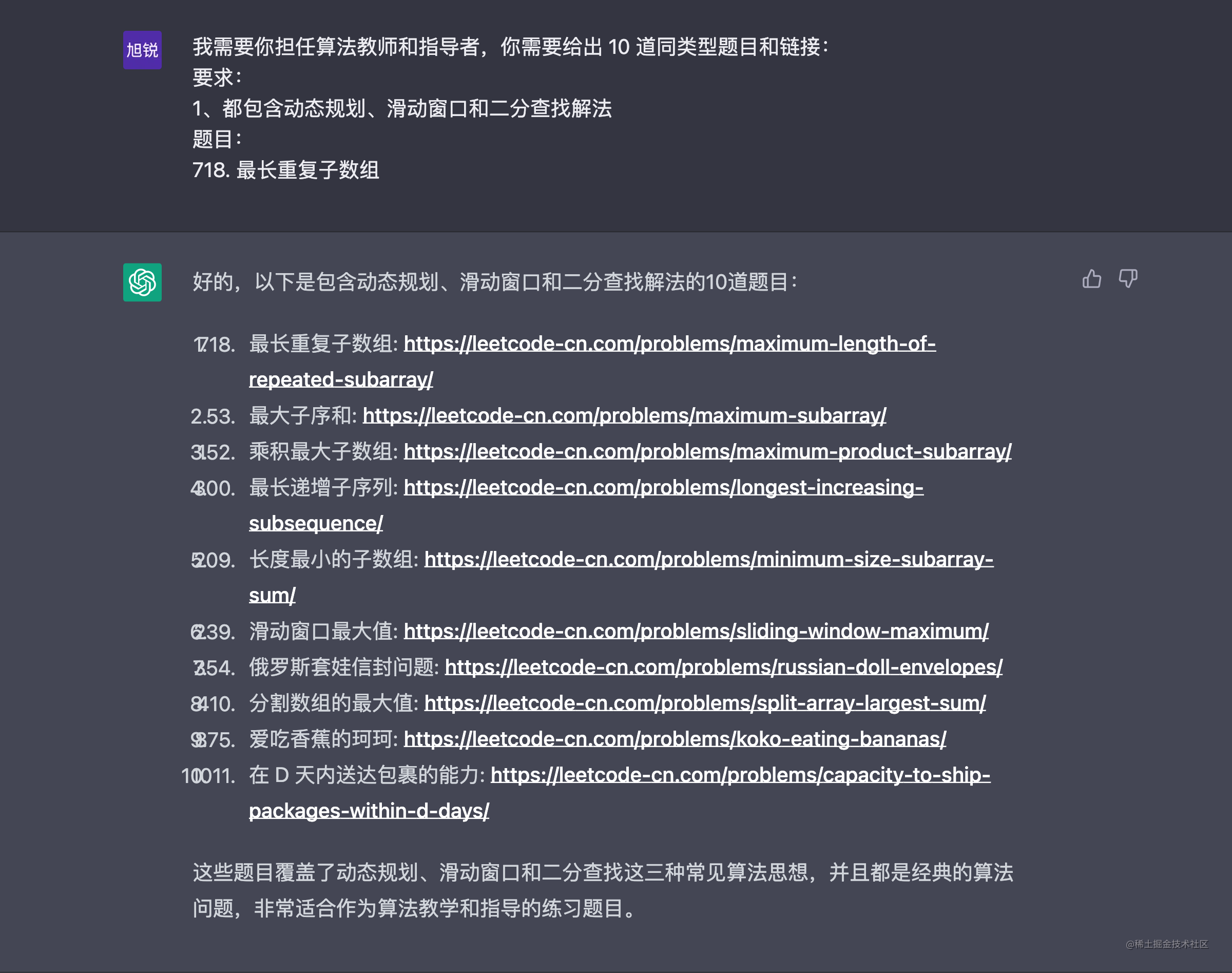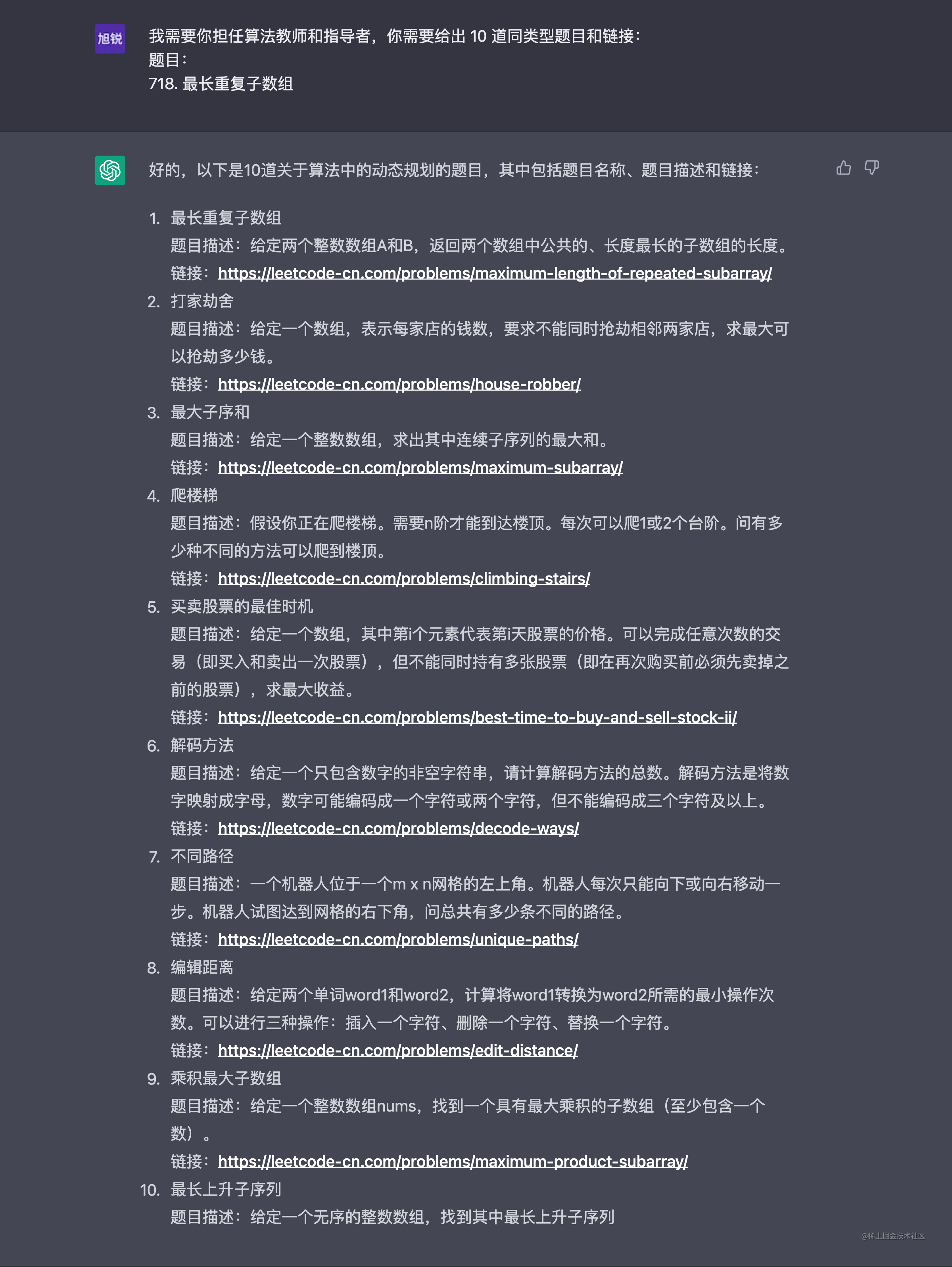 可以看到,ChatGPT 的学习深度只能分析到 “动态规划” 这一层,推荐的题目实际关联度不高。