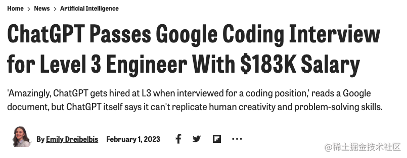 2023 开年以来,全球媒体最火爆的热点莫过于一个生成式 AI 聊天机器人 —— ChatGPT,我们都被大量的信息刷屏了。在这些信息中,你或许看过这样一则新闻 《ChatGPT Passes Google Coding Interview for Level 3 Engineer With $183K Salary》,它说 ChatGPT 通过了谷歌工程师面试,则这个职位的年薪有 18.3 万美元。