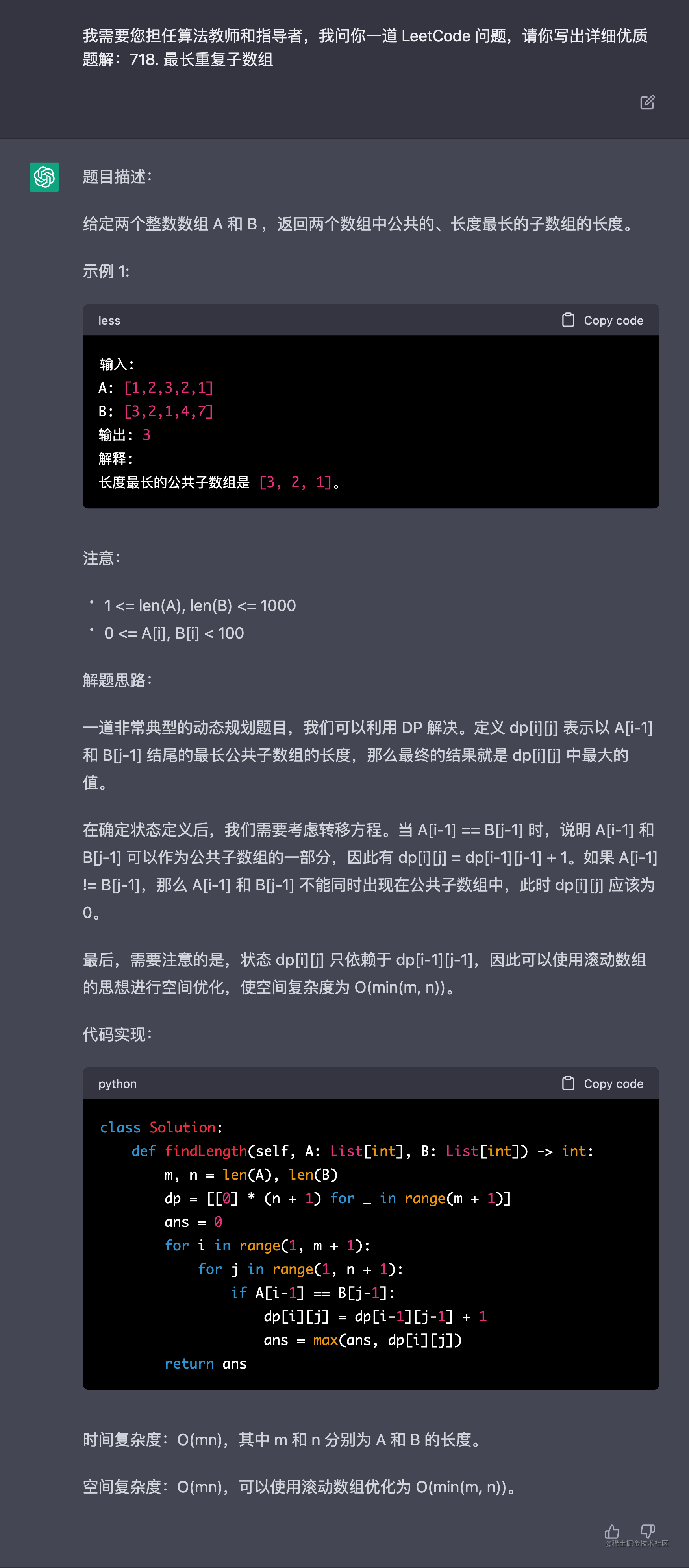 谷歌面试是会考算法的,ChatGPT 已经具备这么强的算法能力了吗?如果答案是肯定的,那么我们借助 ChatGPT 的力量帮助提高算法能力,是不是可行的想法。