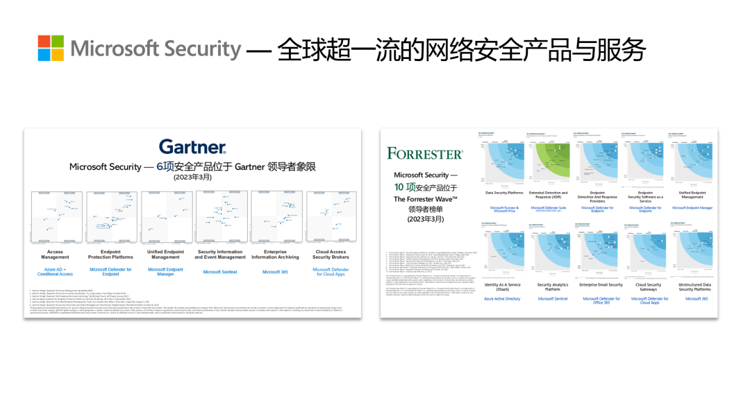 “实战是检验网络安全能力的唯一标准”。微软充分的结合领先地云计算、人工智能/机器学习、安全情报、大数据、自动化等技术,持续地研发、提高和改进安全产品和技术能力,实现全场景、全平台、全生命周期的智能、集成的端到端安全,从而帮助企业组织实现更好的安全防护效能。截止到目前为止,微软有6项安全产品位于 Gartner 领导者象限,10项产品位于 Forrester Wave 领导者榜单,这两个数字都是全球第一的,因此可以充分的证明微软安全相关产品和技术全球领先的能力。