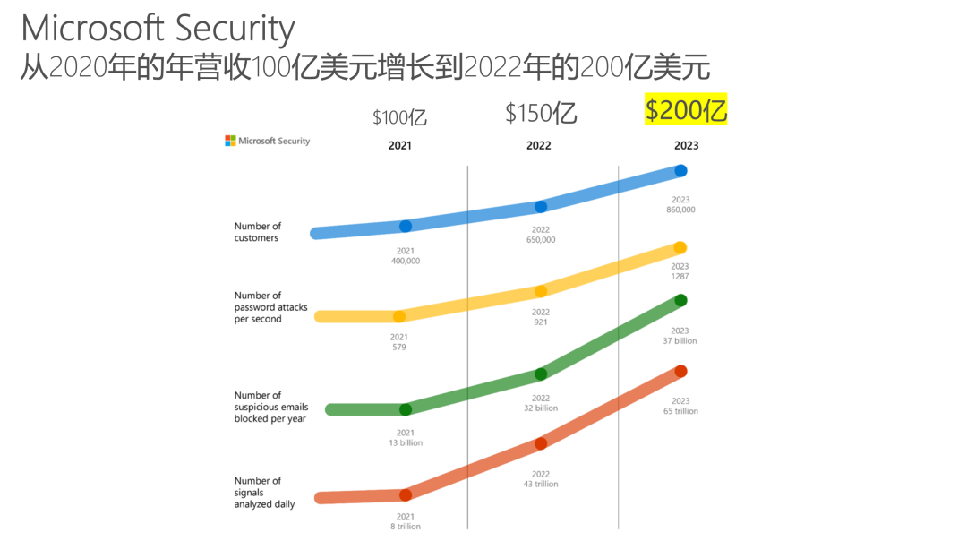 在数据方面,微软拥有全球领先的安全情报和安全大数据。微软每天接收到的安全信号数据超过65万亿,服务于全球超过86万企业客户,在2022年 Microsoft Defender for Office 365阻止的邮件威胁数量超过370 亿,Microsoft Defender for Endpoint 阻止的恶意软件数量超过96亿,Azure AD 阻止的身份验证威胁数量超过347亿。