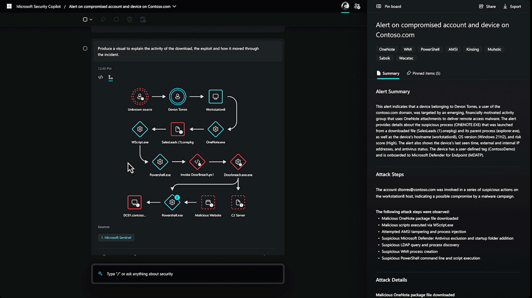 作为全球首个集成对话式 AI/ML 大型语言模型的安全产品,Microsoft Security Copilot 以微软独特的、每日超过65万亿安全信号的安全情报和大数据为基础,通过全球领先的 AI/ML 技术,在 Azure 的全球超大规模基础设施上运行,并符合企业级的网络安全和隐私合规要求。当 Microsoft Security Copilot 收到网络安全专业人员的查询提示时,它会充分运用安全专用模型的力量,基于微软独特的全球安全情报和大数据,对相关场景和用例进行查询和分析,反馈、增强并赋能安全分析人员的工作(如下图所示,通过对话自动生成相关安全事件的攻击链分析和建议)。