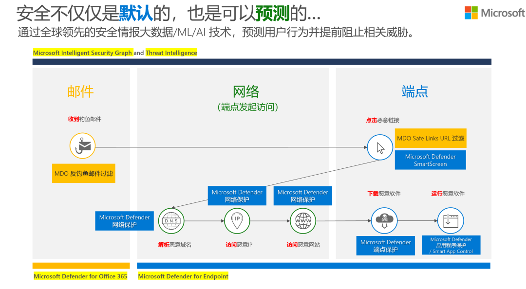 我们认为安全不仅仅是默认的,也是可以预测的。通过全球领先的安全遥测、安全情报、大数据、人工智能/机器学习和自动化技术,我们可以预测恶意行为并提前阻断相关威胁。如下图所示,针对一个钓鱼邮件发起的攻击行为,从收到钓鱼邮件到受害者运行恶意软件,可能看起来只有两个操作步骤,但实际上里面可以拆解为跨多个安全域攻击链的7个攻击操作步骤。在不同的攻击阶段,我们均具有完善的安全检测和防护措施,通过领先的技术预测恶意行为并自动化的第一时间阻断相关威胁攻击,实现智能地、集成地深度纵深防御体系。