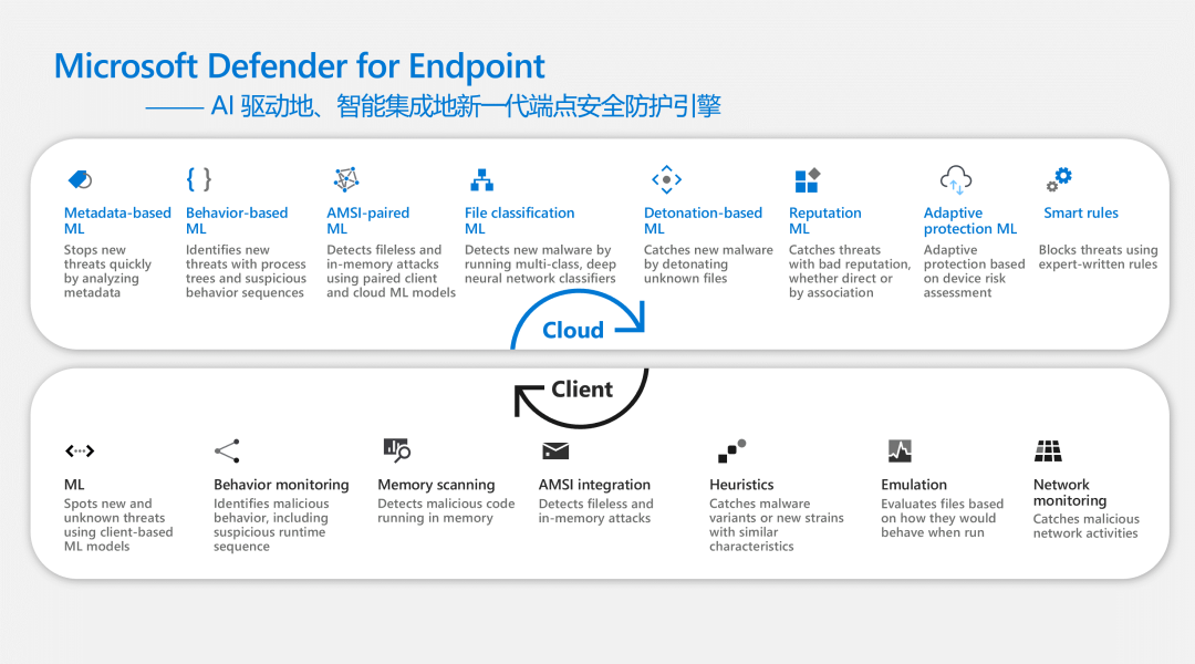 为了加强微软安全产品所提供的自动保护,更好地防范各种网络攻击行为,微软研发了这个基于云的、AI驱动的自适应保护系统。端点设备通过与这个系统的交互,可以结合云端安全情报、大数据、 AI/ML 等先进技术,智能地预测和判断它是否处于危险之中,然后结合AI驱动的自适应保护系统的建议,自动调整安全防护的敏感度并执行相适应的保护和阻断操作,以保护设备并挫败攻击者的下一步行动。