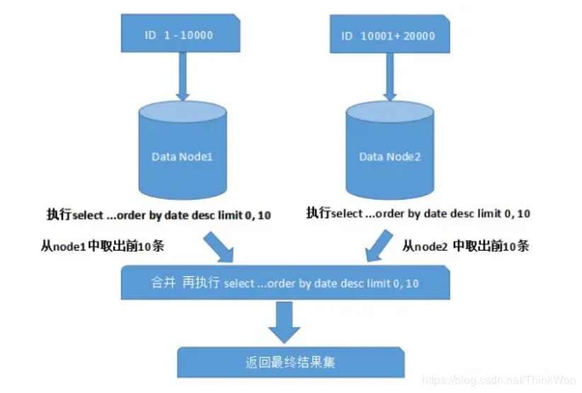 般来讲,分页时需要按照指定字段进行排序。当排序字段就是分片字段的时候,我们通过分片规则可以比较容易定位到指定的分片,而当排序字段非分片字段的时候,情况就会变得比较复杂了。为了最终结果的准确性,我们需要在不同的分片节点中将数据进行排序并返回,并将不同分片返回的结果集进行汇总和再次排序,最后再返回给用户。如下图所示: