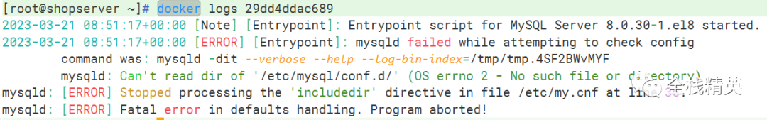 错误原因是:从上面报错信息可以看出 mysqld: Can't read dir of '/etc/mysql/conf.d/' (无法读取/etc/mysql/conf.d/目录)。这样就知道原因了,mysql找不到conf.d目录。所以启动容器时指定到conf.d目录