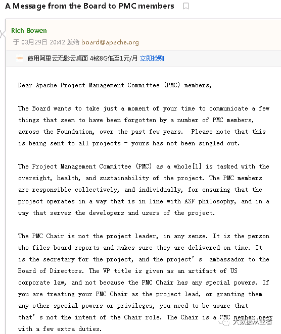 前两天收到Apache软件基金会董事Rich Bowen(上图这个老头)群发的邮件,大意就是强调个别Apache项目PMC别忘记自己职责和权限,着重强调PMC Chair不是leader、不能为所欲为(感兴趣的自行到邮件列表吃瓜吧)。