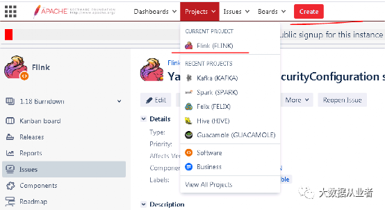 Projects选择Flink,然后通过Create按钮创建一个问题单: