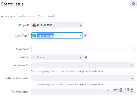 问题单可以选择类型(Bug或Improvement)。然后,Summary主要描述你贡献的代码所修复的问题或者新增的优化功能。强调一点:虽然只有*号为必选项,但还是建议填充所有选项(贡献代码所属的模块、影响的版本、修复的版本)。