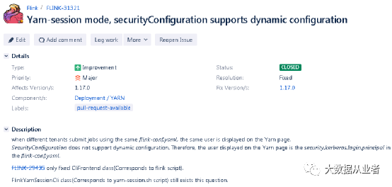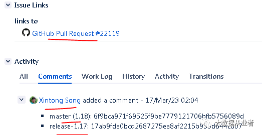 如果你的代码成功合入到Flink项目,你所创建的问题单将会分配给你,并被关闭。同时,问题单评论区会标注合入的分支与commit id,如图: