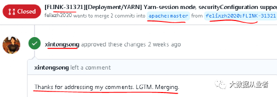 虽然所有人都可以review你提交的代码。如果感觉review意见合理,可以修改代码重新提交。或者也可以说明理由不进行修改。最终,只有项目PMC或者committer才能决定你的代码是否可以合入Flink项目。如果review ok,通常会允许merge,如图: