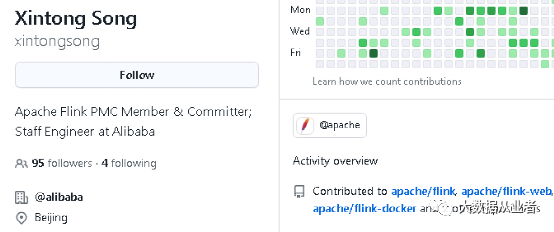 查看了这位大佬github主页,任职于阿里巴巴,担任Flink PMC: