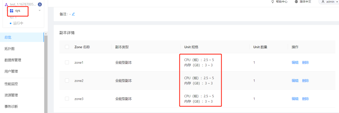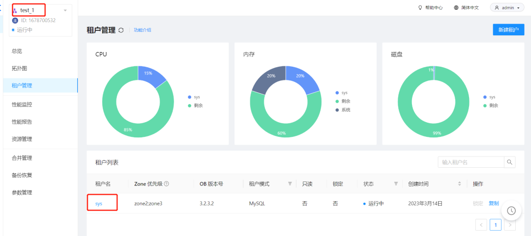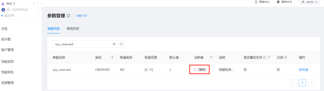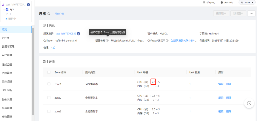当前sys租户的 min cpu 为 2.5,并且当前集群只有一个sys租户,因此资源水位cpu显示的是 2.5