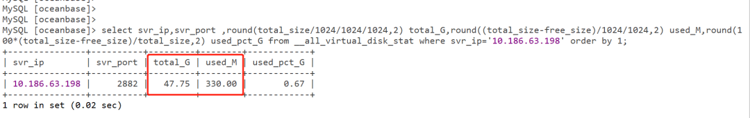 登录sys租户查看 observer 10.186.63.198 存储使用情况,当前存储使用330M