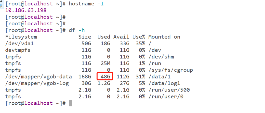 登录服务器查看磁盘空间可以看到 OceanBase 初始化后的数据文件总大小48G