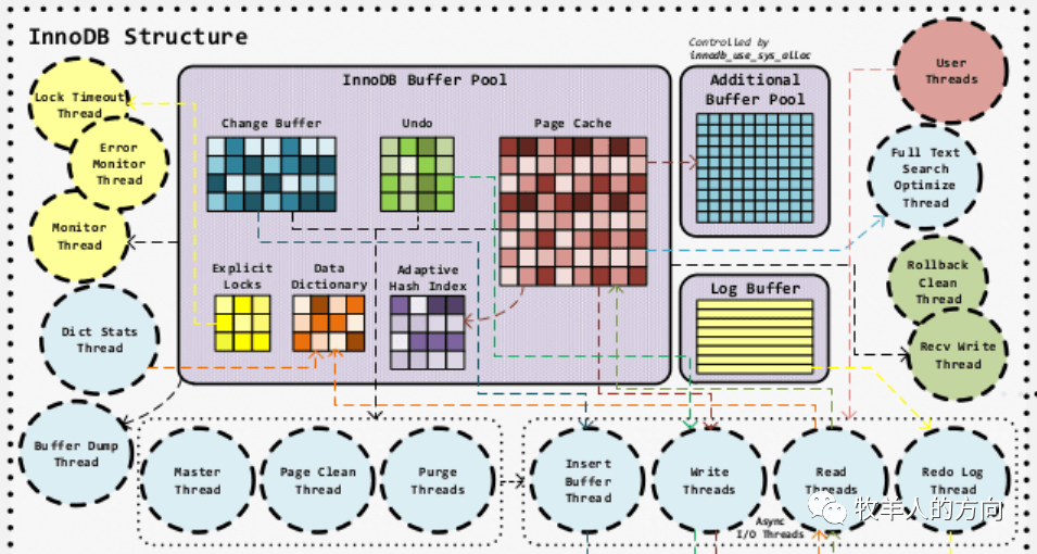 上图是MySQL存储引擎InnoDB的后台线程,在“InnoDB存储引擎解密”中详细介绍了。InnoDB后台线程主要用于维持服务器的正常运行和完成用户提交的任务,主要包括:master thread、page cleaner thread、purge thread、read thread、write thread、redo log thread、insert buffer thread、monitor thread、error monitor thread、lock monitor thread等。