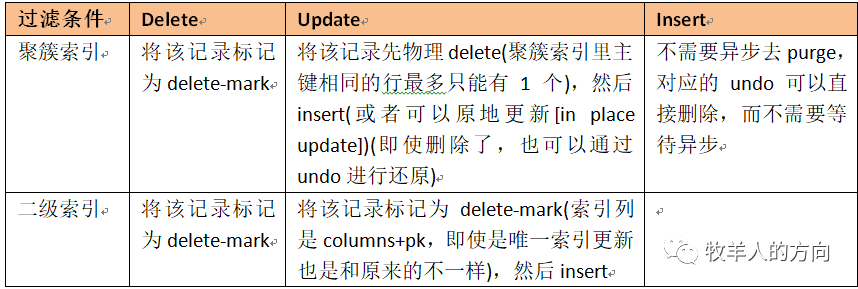 Page页标记为已删除的原因有两点:1)该事物可能需要回滚,先作保留;2)当事物1去删除pk=1且没有提交时,事物2要能看到pk=1的记录(事物的隔离性)。根据不同的过滤条件,对删除标记的处理也不一样,如下表所示: