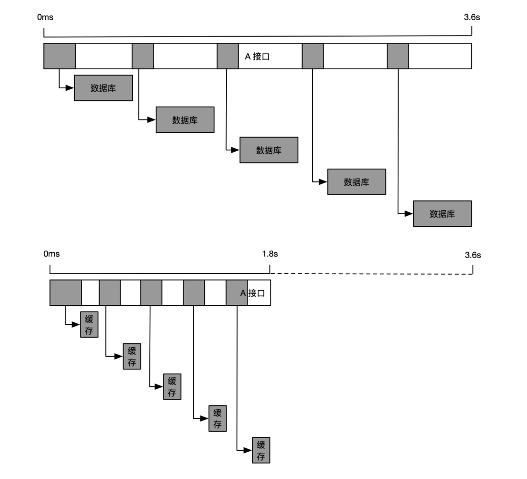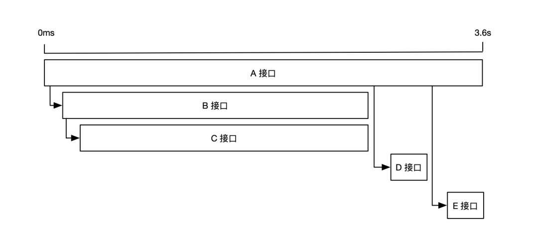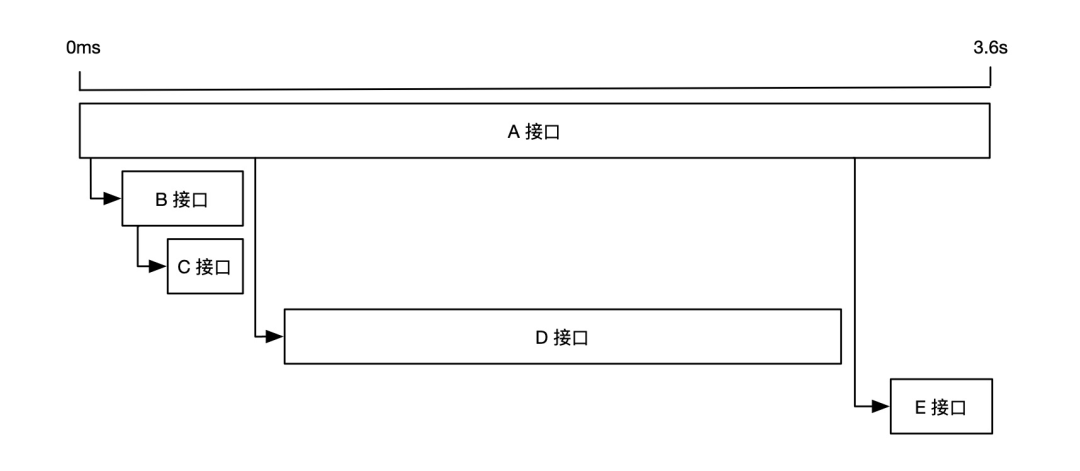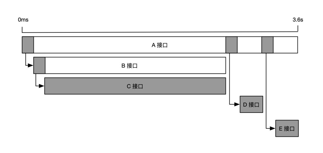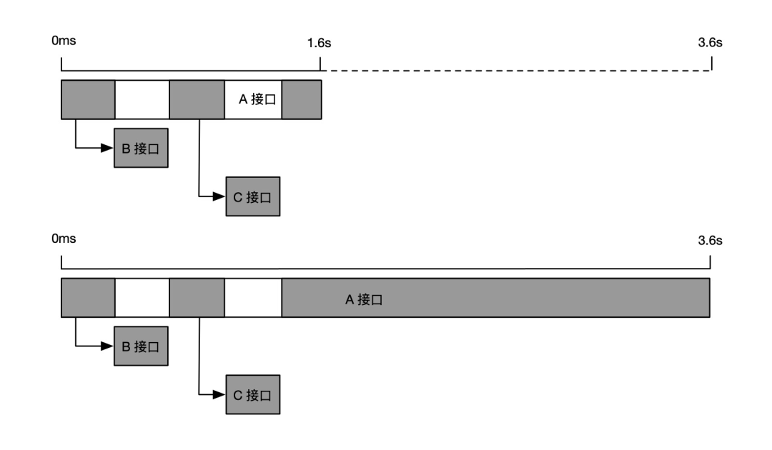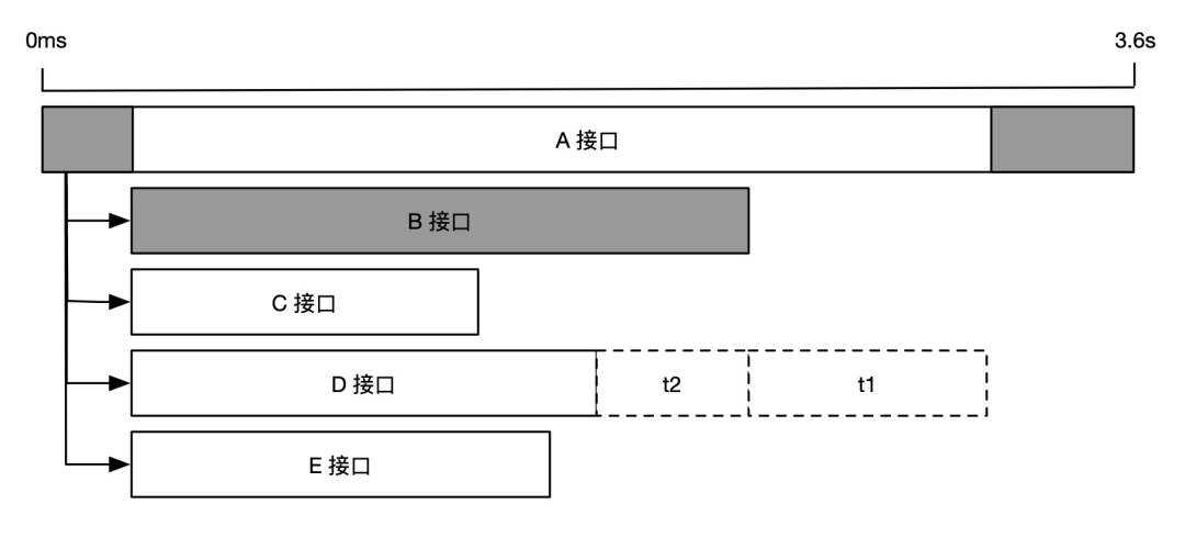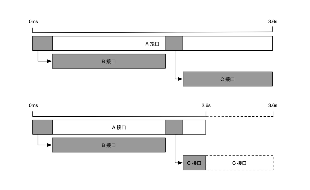 如果一次 Span 调用有 t 段耗时在关键路径上,那么去掉这 t 段耗时,整条链路的总体耗时也会相应的缩短 t 段时间。仍以上面那条链路为例,灰色部分表示关键路径,缩短任意关键路径上的耗时都可以减少整体耗时。此时,我们可以判断 A 接口超时的主要原因是 C 接口导致的。