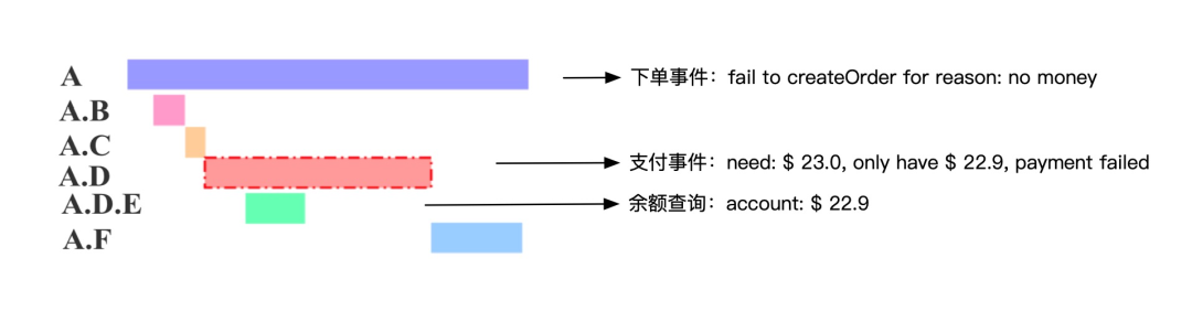 应用日志:应用日志可以说是我们最熟悉的一种日志,我们会将各种业务或系统的行为、中间状态和结果,在开发编码的过程中顺手记录到应用日志中,使用起来非常方便。同时,它也是可读性最强的一类日志,即使是非开发运维人员也能大致理解应用日志所表达的含义。因此,我们可以将 TraceId 也记录到应用日志中进行关联,一旦出现某种业务异常,我们可以先通过当前应用的日志定位到报错信息,再通过关联的 TraceId 去追溯该应用上下游依赖的其他信息,最终定位到导致问题出现的根因节点。
