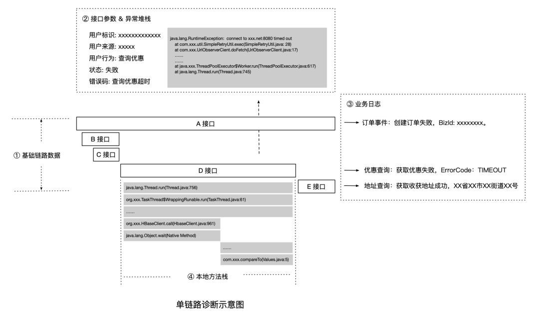根据 TraceId、应用名、接口名、耗时、状态码、自定义标签等任意条件组合过滤出目标调用链。 从满足过滤条件的调用链列表中选中一条链路查询详情。 结合请求调用轨迹,本地方法栈,主动/自动关联数据(如SQL、业务日志)综合分析调用链。 如果上述信息仍无法定位根因,需要结合内存快照、Arthas 在线诊断等工具进行二次分析。