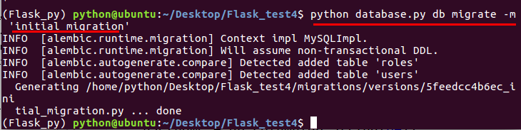 #创建自动迁移脚本python database.py db migrate -m 'initial migration'