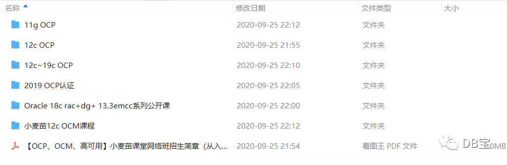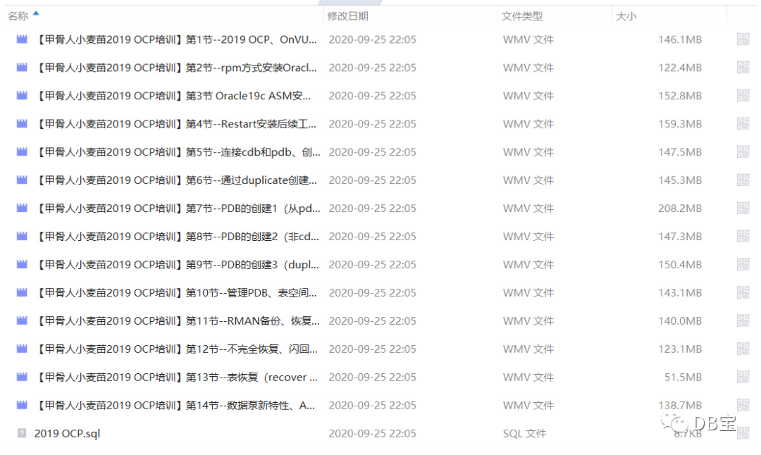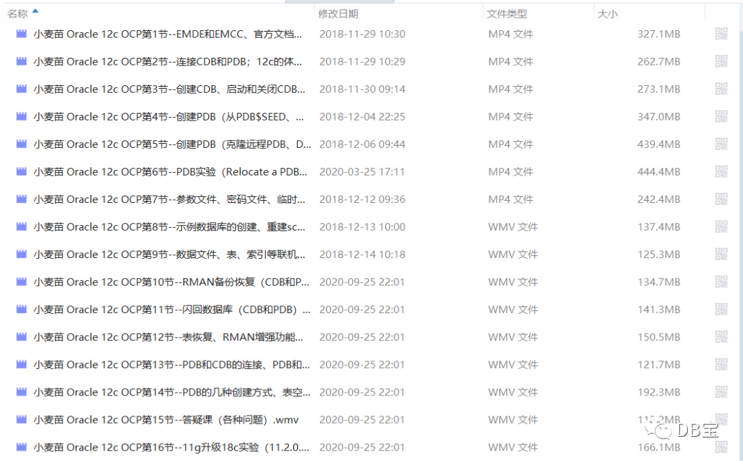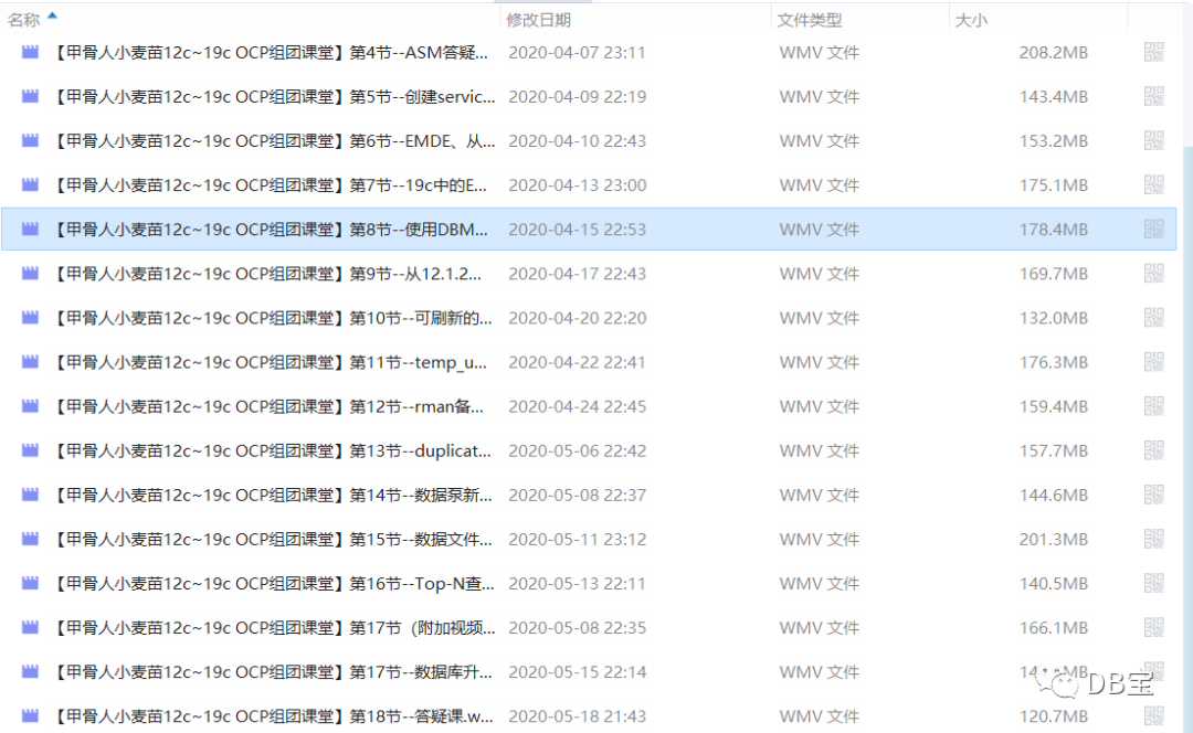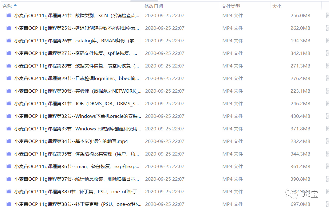 小麦苗OCP 11g课程第1节--RHEL5.5的安装和基本配置(使用逻辑卷):https://v.qq.com/x/page/u0534y1g6u3.html小麦苗OCP 11g课程第2节--数据库软件的图形化安装和静默安装,MD5,配置YUM源,安装rlwrap软件:https://v.qq.com/x/page/m05348z2s4v.html小麦苗OCP 11g课程第3节--图形化建库、静默建库、静默删库、干净地卸载数据库软件、配置数据库资源开机启动、pmap、判断数据库位数等:https://v.qq.com/x/page/x0535r1ucah.html小麦苗OCP 11g课程第4节--SQL语句的分类,如何查看在线和离线文档、sqlplus的使用和设置(导出csv和html文件)、ERRORLOGGING的作用小麦苗OCP 11g课程第5节--基本SELECT语句的写法,NULL的注意事项,Quote (q)语法、模糊查询、WHERE子句和排序小麦苗OCP 11g课程第6节--IS NULL走索引,LIKE模糊查询走索引,DUAL表详解(包括恢复),Oracle中的函数、隐式类型转换:https://v.qq.com/x/page/s0540b5ih94.html小麦苗OCP 11g课程第7节--函数的高级应用,组函数,COUNT的用法和区别,MAX和MIN优化写法:http://v.qq.com/x/page/l0540f9nhgh.html小麦苗OCP 11g课程第8节--多表连接、笛卡儿积、层次查询(树形查询)、WITH语法、子查询、合并查询(集合查询)、connect by和笛卡儿积快速构造大表小麦苗OCP 11g课程第9节--创建和管理表、数据字典、数据类型介绍、操作数据(INSERT、UPDATE、DELETE、MERGE)、DML语句优化的方法小麦苗OCP 11g课程第10节--约束、视图、外键约束必须创建索引(死锁)、Top-N 分析、物化视图简介小麦苗OCP 11g课程第11节--序列、索引、同义词、DBLINK、为什么索引没有被使用、哪些操作会导致索引失效、监控索引的使用、预估索引的大小、索引的选择性小麦苗OCP 11g课程第12节--匿名块、存储过程、函数、包的开发、异常处理、自治事务、分批提交DML、利用触发器完成一些监控功能、存储过程和函数返回集合类型小麦苗OCP 11g课程第13节--ASM的安装和配置、磁盘组的简单维护、创建ASM磁盘的几种常见方式(asmlib)、静默安装GRID软件、EM的创建和使用、如何查看磁盘是否包含数据、如何让crs_stat命令显示完整、kfod命令等:http://v.qq.com/x/page/s0560te3pju.html小麦苗OCP 11g课程第14节--体系结构(内存结构、进程结构、存储结构)--内存组件(SGA+PGA)、数据库和实例的区别、ASMM和AMM、归档模式的切换、多路复用控制文件等小麦苗OCP 11g课程第15节--EM的维护、参数文件(spfile和pfile)、启动和关闭、告警日志、Oracle Restart(重点)等:http://v.qq.com/x/page/j06000r2u4a.html小麦苗OCP 11g课程第16节--ASM相关维护(磁盘组、OS和ASM文件格式转换)等小麦苗OCP 11g课程第17节--Oracle网络管理(动态注册和静态注册、限定IP访问、sqlnet.ora、listener.ora、tnsnames.ora文件的作用、TWO_TASK、SYS登录报权限不足、ORA-12547等)小麦苗OCP 11g课程第18节--表空间和数据文件管理(bigfile、OMF、表空间大小查询、表空间扩展、表空间配额、移动数据文件、如何删除表空间数据文件)小麦苗OCP 11g课程第19节--数据库用户管理、权限和角色、密码文件(Oracle的两种认证方式等等)小麦苗OCP 11g课程第20节--锁和会话(视图之间的关联关系、如何彻底杀掉会话等)、Undo(作用,存储内容、快清除、ORA-01555)、审计(分类,FGA审计、sysdba审计、AUD$表迁移等)小麦苗OCP 11g课程第21节--AWR(如何获取和阅读)、ASH(如何诊断系统问题)、ADDM、统计信息(学好SQL优化必修的一节课)等小麦苗OCP 11g课程第22节--exp、imp(从dmp文件获取相关信息,例如查看字符集,延迟段创建等)、数据泵expdp和impdp(彻底停止expdp,exclude、include,TTS,network_link,expdp卡死等)等小麦苗OCP 11g课程第23节--sqlldr(各种错误处理、酒店开房数据导入)、外部表(字符集设置)、补丁集更新(PSU、one-off补丁、热补丁)小麦苗OCP 11g课程第24节--故障类别、SCN(系统检查点SCN、文件检查点SCN、开始SCN和结束SCN)、实例恢复(前滚和回滚)、闪回体系(包括7种闪回技术及其原理)、DBA_SOURCE的使用小麦苗OCP 11g课程第25节--延迟段创建导致不能导出空表(只在11.2.0.1中存在)、RMAN简介及其常用命令(show all的配置、list、report、delete等)、备份恢复的类型小麦苗OCP 11g课程第26节--catalog库、RMAN备份(累积和差异增量备份)、块改变跟踪、备份脚本分享、定时任务(crontab + windows下的任务计划)小麦苗OCP 11g课程第27节--密码文件恢复、spfile恢复、控制文件恢复、在线redo和归档文件的恢复、v$archived_log的清理小麦苗OCP 11g课程第28节--数据文件恢复、表空间恢复(Undo表空间的恢复)、DRA(数据恢复顾问)、rm -rf误操作的恢复过程、TRUNCATE恢复方法、在丢失归档的情况下如何进行数据文件的恢复小麦苗OCP 11g课程第29节--日志挖掘logminer、bbed简介、坏块的检测(dbv、rman等)和恢复(BMR、bbed等)、如何确定坏块的对象名、OS备份(冷备和热备及其恢复)、非归档模式备份和恢复、RESETLOGS和NORESETLOGS区别、跨版本恢复、只存在备份片的恢复、恢复流程图小麦苗OCP 11g课程第30节--实验课(数据泵之NETWORK_LINK、duplicate from active复制数据库ASM到FS、TSPITR(表空间基于时间点恢复)、TTS(传输表空间))、测试库搭建等小麦苗OCP 11g课程第31节--JOB(DBMS_JOB、DBMS_SCHEDULER、创建删除JOB、是否正在运行、运行日志、故障处理)、分区表(分区类型、分区表查询优化、索引失效、普通表转换为分区表有哪些办法、压缩分区、分区表收集统计信息)小麦苗OCP 11g课程第32节--Windows下单机oracle的安装(11.2.0.4)--图形界面和静默安装小麦苗OCP 11g课程第33节--Windows下数据库创