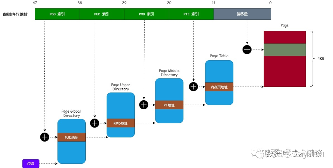 内存映射是以内存页为单位,默认大小是 4KB 。在 64位系统中,Linux 只使用了 64位虚拟地址中的前 48 位,并且分为 5 部分。最后一部分长度为 12 ,对应的是物理内存页内偏移地址(容量 4KB)。前面 4 部分设计主要是降低页表管理成本,不是本文重点。