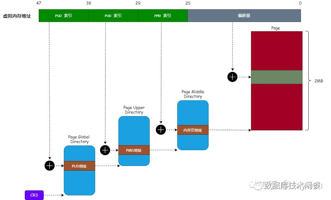 现在物理内存都很大,4KB 的页表就显得非常小,导致页表项非常多,占用的内存也很大。所以才有更大的内存页出现了。如 2MB 的页表(据说还有支持1GB,没见过不讨论)。此时虚拟内存地址只需要 4 部分,最后一部分长度 21 位,是内存大页内的偏移地址。