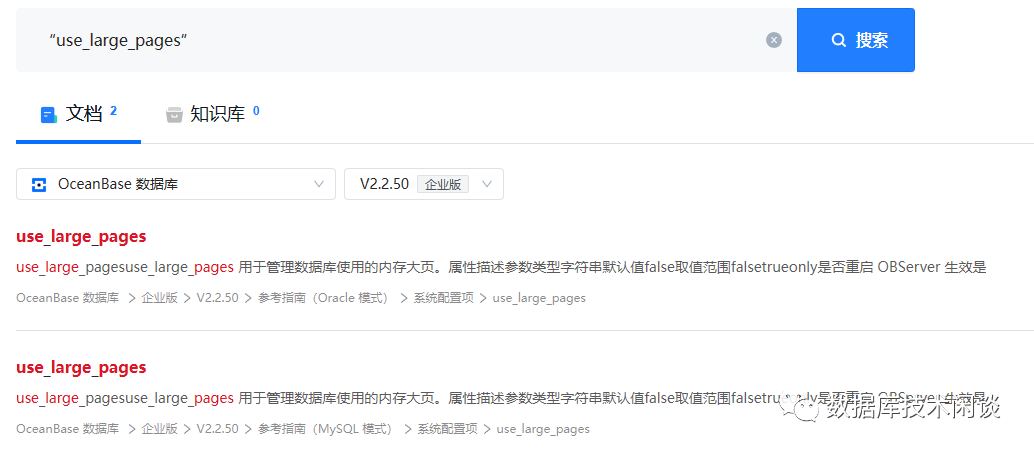 前面说了,光操作系统支持大页还不够,还要应用程序支持,也就是看 OB 进程 observer 是否支持大页。从 OB 官网文档看,从企业版 V2.2.50 开始才支持大页,参数名:use_large_pages ,默认值是 false ,即不使用内存大页。
