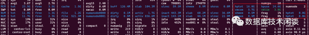 然后观察 atop 命令的输出。可以看到两个 NUMA node 的内存使用情况。其中字段 hptot 有值就表示开启了大页,字段 hpuse 表示实际大页内存的使用大小,这个随着 OB 业务读写而变化。