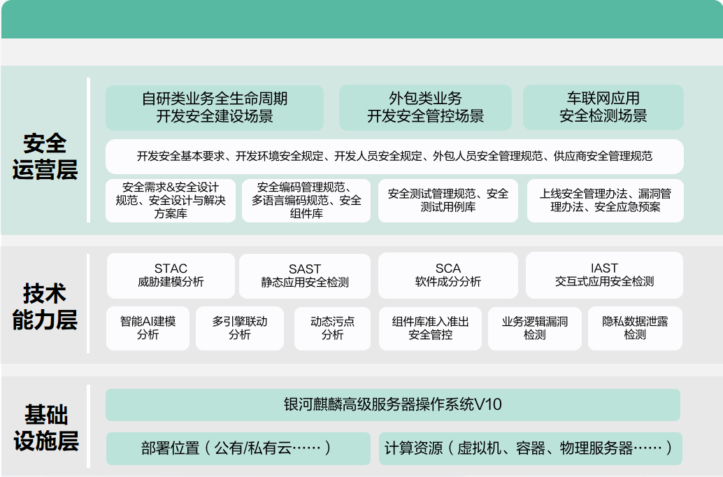方案以十四五规划、等级保护2.0、个人信息安全规范、ICT供应链安全风险管理指南以及各行业应用安全要求为指导,使用国产硬件平台搭载银河麒麟高级服务器操作系统V10,发挥操作系统安全稳定优势,结合默安科技自研的引擎和模型算法,从系统开发的需求、设计、开发、测试、上线等阶段入手,深度识别系统应用可能存在的各类安全风险,实现对设计、需求、代码、组件、API、功能等方面的安全管控,全面提升应用自身的安全性,配合定制化的安全运营服务,构建应用全生命周期的安全开发运营体系。