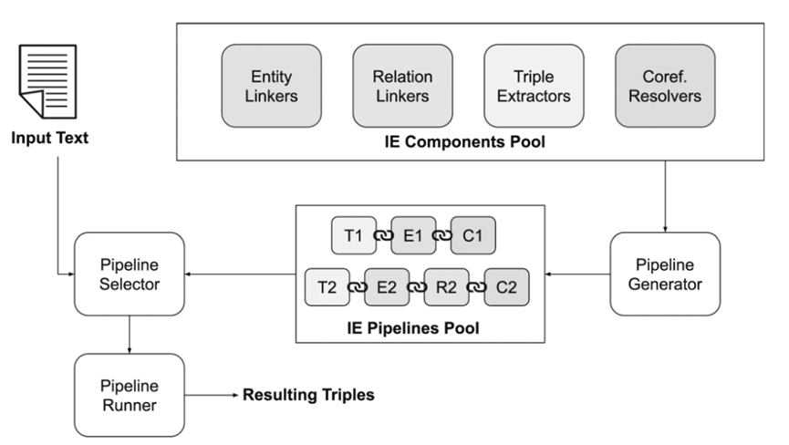 在这个工作中,作者集成了知识图谱构建过程中的信息抽取流水线的多个模块——实体链接、关系链接、三元组抽取、共指消解,引入了多个典型方法,并设计了一个基于Roberta分类的动态流水线选择器,使得对于输入文本,Plumber系统可以自动选择最佳的信息抽取组件进行三元组抽取和知识图谱构建,整体框架如下图所示。