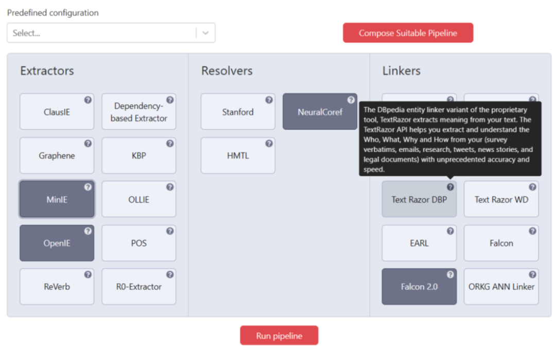 Plumber集成了信息抽取领域的40个经典工作,并基于独立、可复用和可扩展的原则设计了一个信息抽取平台,其用户界面如下图所示。用户既可以手动配置信息抽取的各个环节,也可以受益于平台的流水线选择器进行自动的组件配置,极大的降低了开放信息抽取任务的训练和配置成本。文章也用实验证明了Plumber流水线选择的优势和它在端到端的知识图谱构建任务中的性能。
