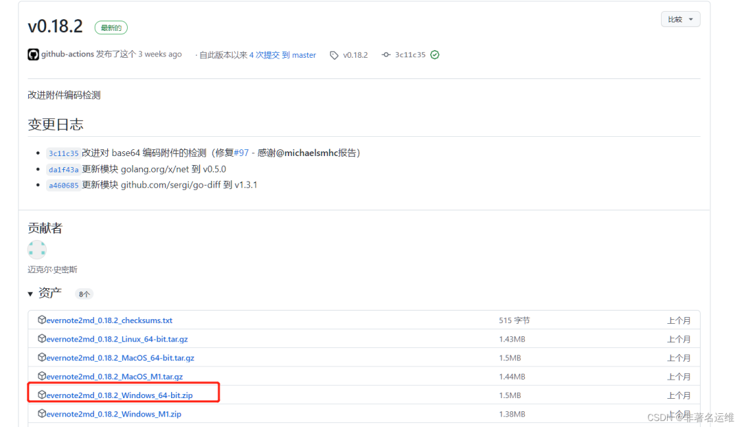 一般就下载最新版本的格式转换工具( 比如 v0.18.2 ),打开下载页面,点击自己需要的版本进入, 我直接下载的v0.18.2 Windows版本的转换工具,Widows版、MacOS版与Linux版本的都有,根据自己需要的版本下载。evernote2md_0.18.2_Windows_64-bit.zip