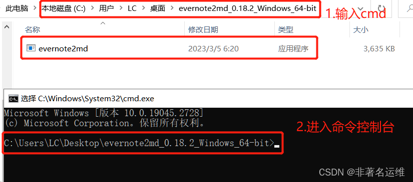 可以看到进入的命令控制台为当前转换工具evernote2md的目录,这么做是为了方面后面输入转换命令时,系统能够找到工具所在的位置,不然会报错。(但是这里也可以输入转换工具的绝对路径来解决)
