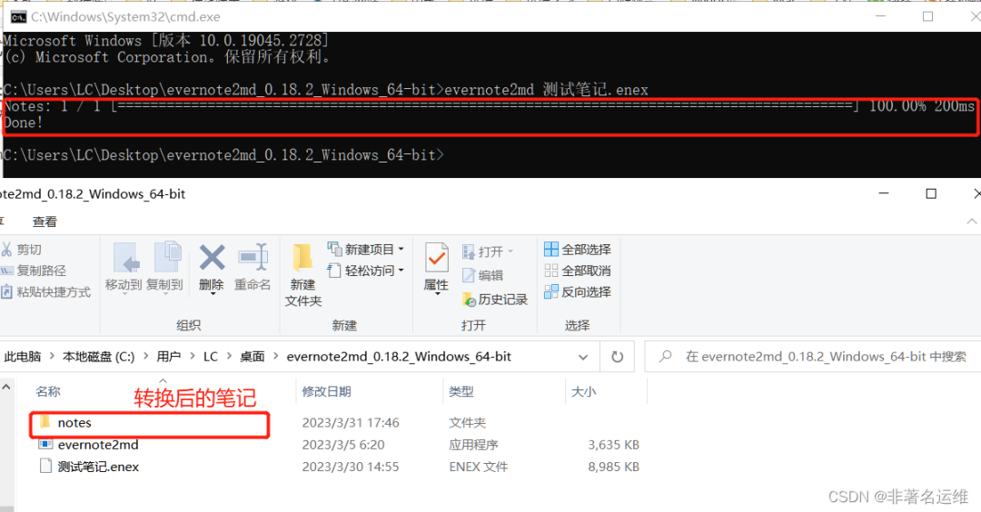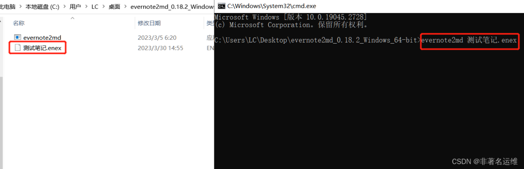 2.3将需要转化的enex文件放在evernote2md所在的文件夹目录下,然后在命令行中输入evernote2md “要转换的文件全名带后缀”