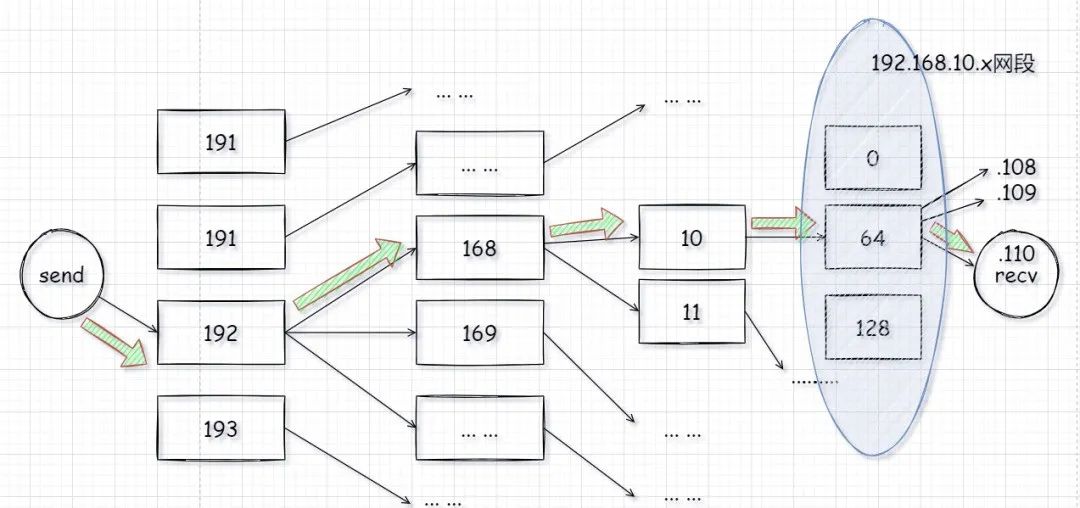 “同理,ip 地址也具备此功能,通过 IP 地址的网络位可以确定某个主机所在网络的位置,从而明确一条数据传送的路径。例如目的地址为 192.168.10.110/26,则该地址所在的网络为 192.168.10.64