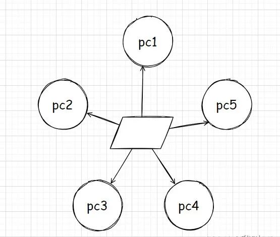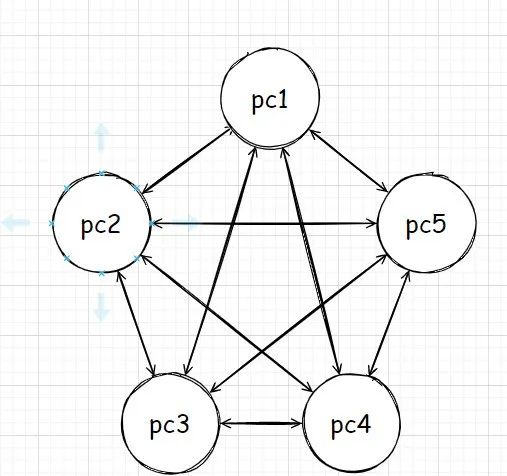 “首先我们需要明确的是,MAC 地址的诞生早于 IP 地址。在计算机设计之初,设备之间使用 MAC 地址互相确认身份,因为当时的网络拓扑并不大,我们完全可以让两台计算机之间两两互相发送数据。如果有 5 个主机需要互通的话,那么它的拓扑结构可能是这样: