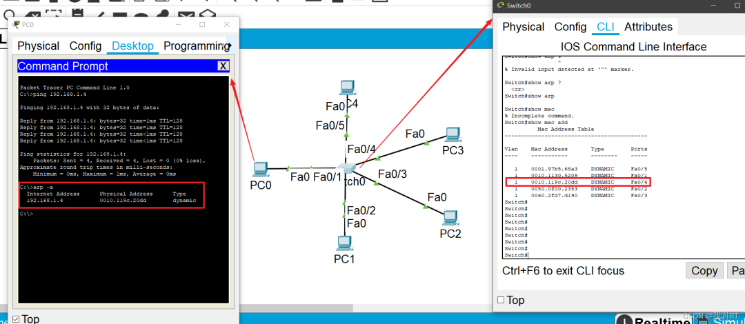 “这样,当 pc0(192.168.1)ping pc3(192.168.4)时,交换机查自己的 mac 表,发现自己的以太网 fa0/4 接口的出口对应的就是目的主机 mac 地址,则交换机将自己该数据报文转发从 fa0/4 接口转发出去。同时 pc3 收到了来自 pc0 的数据报文。