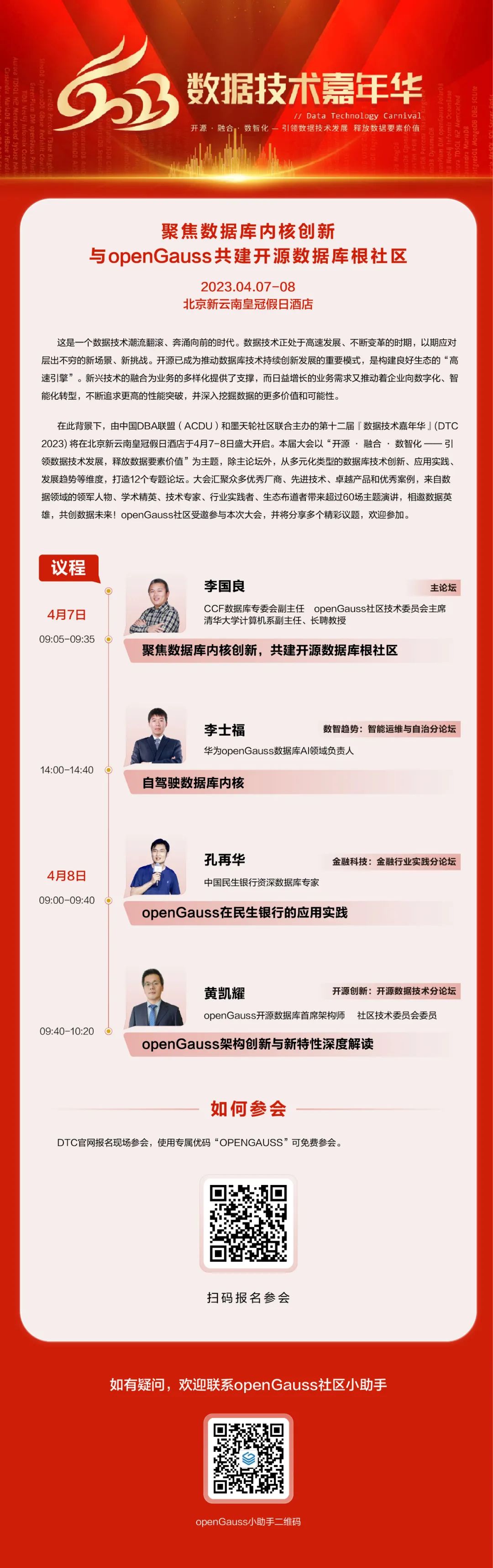 由中国DBA联盟和墨天轮社区共同主办的第十二届数据技术嘉年华(DTC 2023)将于4月7-8日在北京新云南皇冠假日酒店举办。openGauss深度参与其中,将派出3位重量级技术专家和民生银行用户代表,分别在主论坛和三个专题论坛发表演讲,为大家分享openGauss开源数据库内核能力、架构创新、创新特性和落地实践成果,精彩内容抢先预览,文末还有免费参会福利哦!