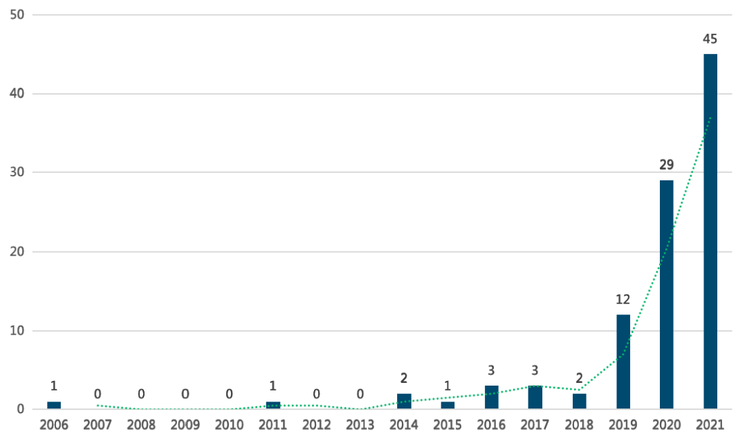 2006-2021年中央及各地方政府出台信创相关政策数量变化趋势