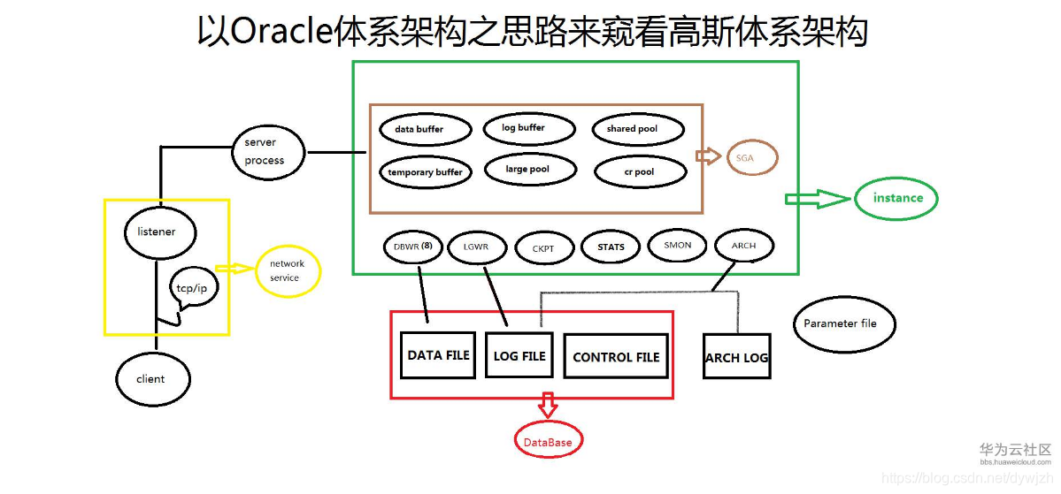 跟oracle数据库一样,gaussdb 由实例和数据库组成,数据库是一系列的文件,实例是进程加内存结构(只有SGA,没有PGA)。