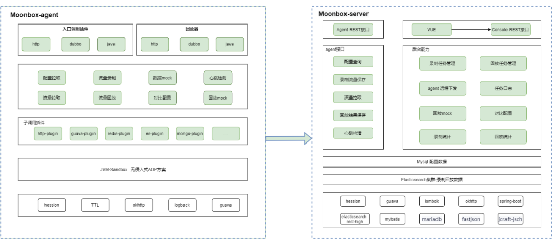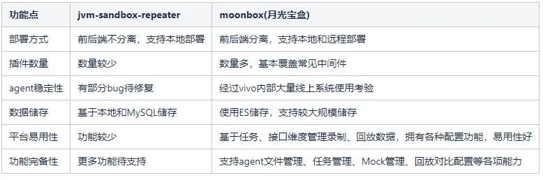 Moonbox是基于jvm-sandbox-repeater重新开发的一款流量回放平台产品。在jvm-sandbox-repeater基础上重写了很多模块,并提供了更加丰富功能,同时便于线上部署和使用,和jvm-sandbox-repeater差异如下: