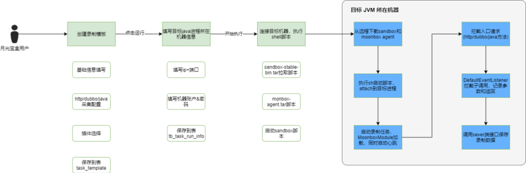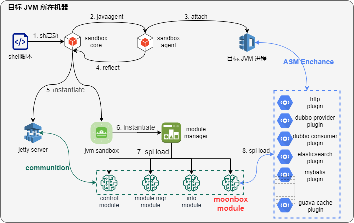 执行脚本将sandbox agent attach到目标java进程上,sandbox 启动jetty服务,加载moonbox module,然后从服务端拉取moonbox配置,加载流量录制和回放插件。